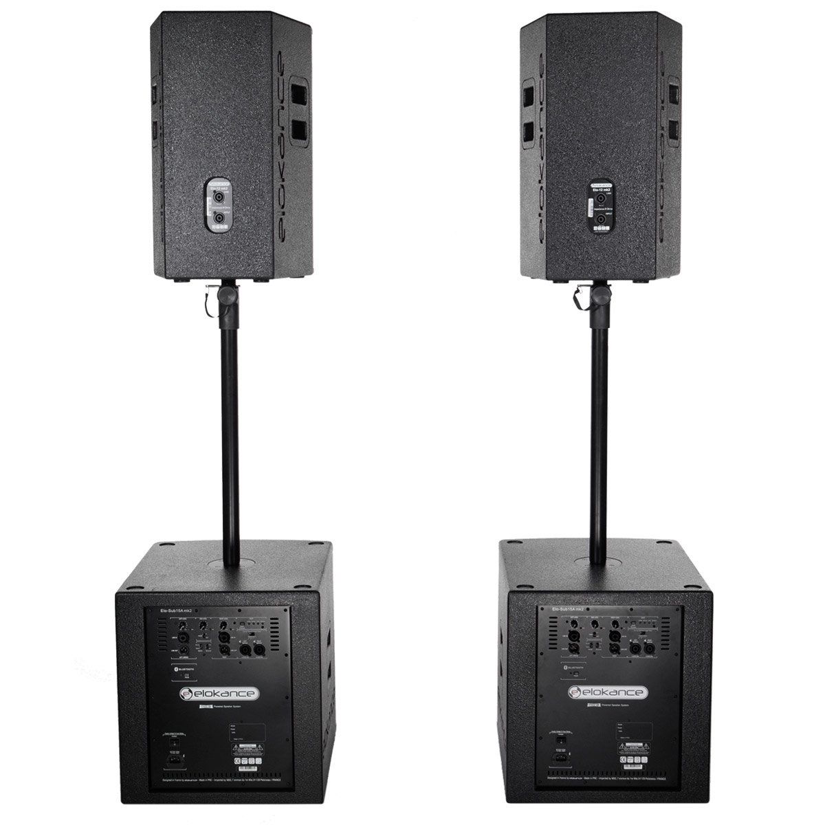 Système Amplifié 4 voies 1500W RMS Elokance Elo 1500 MK2, composé de 2 ELO 12 MK2 et 2 ELO SUB15A MK2. Livré avec 2 barres de couplage et 2 câbles Speakon 6m PLUGGER. Le ELO 1500 MK2 est maintenant doté d'un DSP permettant ainsi d'optimiser le son de votre système selon son utilisation